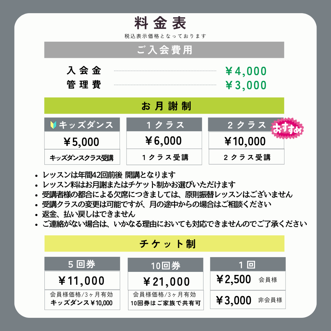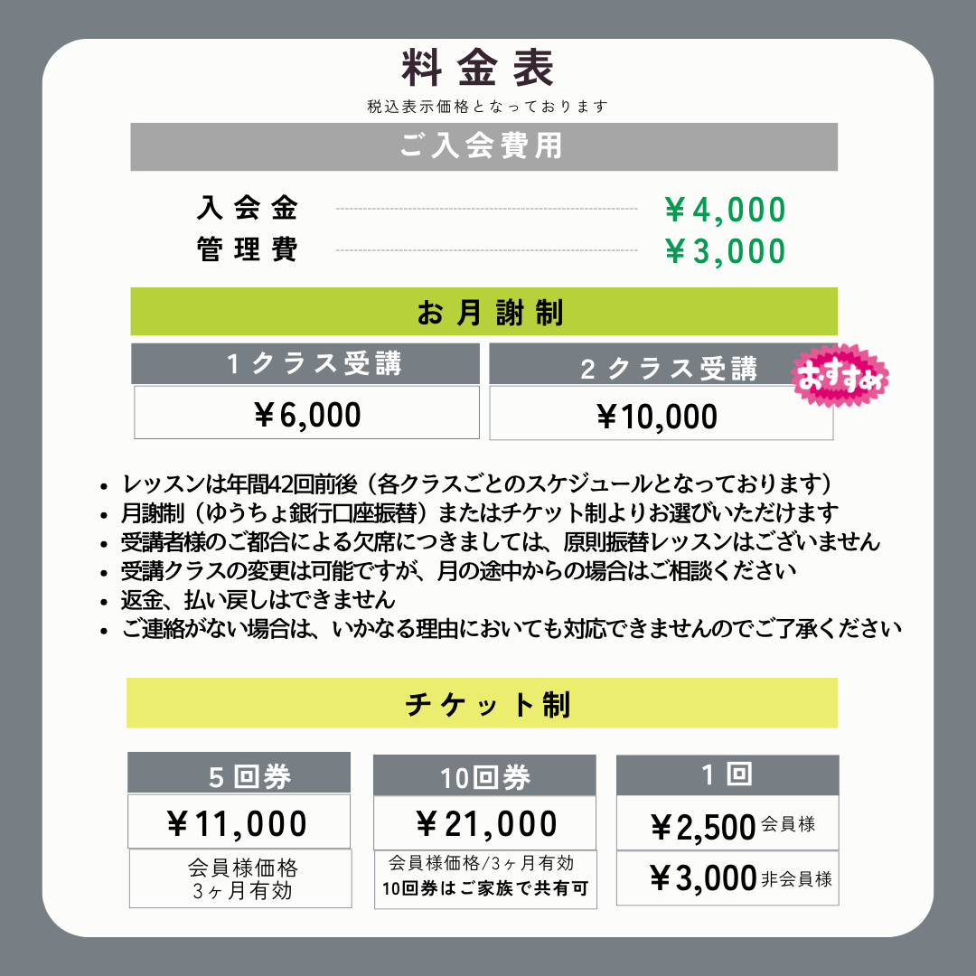 ご入会に関すること、お月謝、チケット(ご利用有効期限 3ヶ月)のご利用についてなど、まずはお気軽にお問い合わせください。
